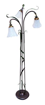 Торшер Анна - это металлический торшер в цвете ржа в стиле флористика, по форме напоминает букет колокольчиков. Три рожка направленные вниз, что очень удобно - не будет скапливаться пыль, насекомые. Плафоны белые матовые, изготовлены из толстого прочного стекла в форме колокольчика с необычным текстурным рельефом, хорошо гармонируют с цветом и дизайном самого торшера.